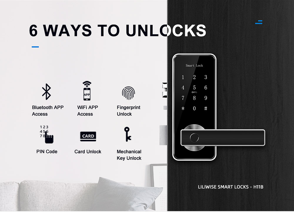 1. 6 ways to unlock: WiFi APP Access, Bluetooth APP Access, Fingerprint Unlock, PIN Code, Card, Mechanical Key Unlock;